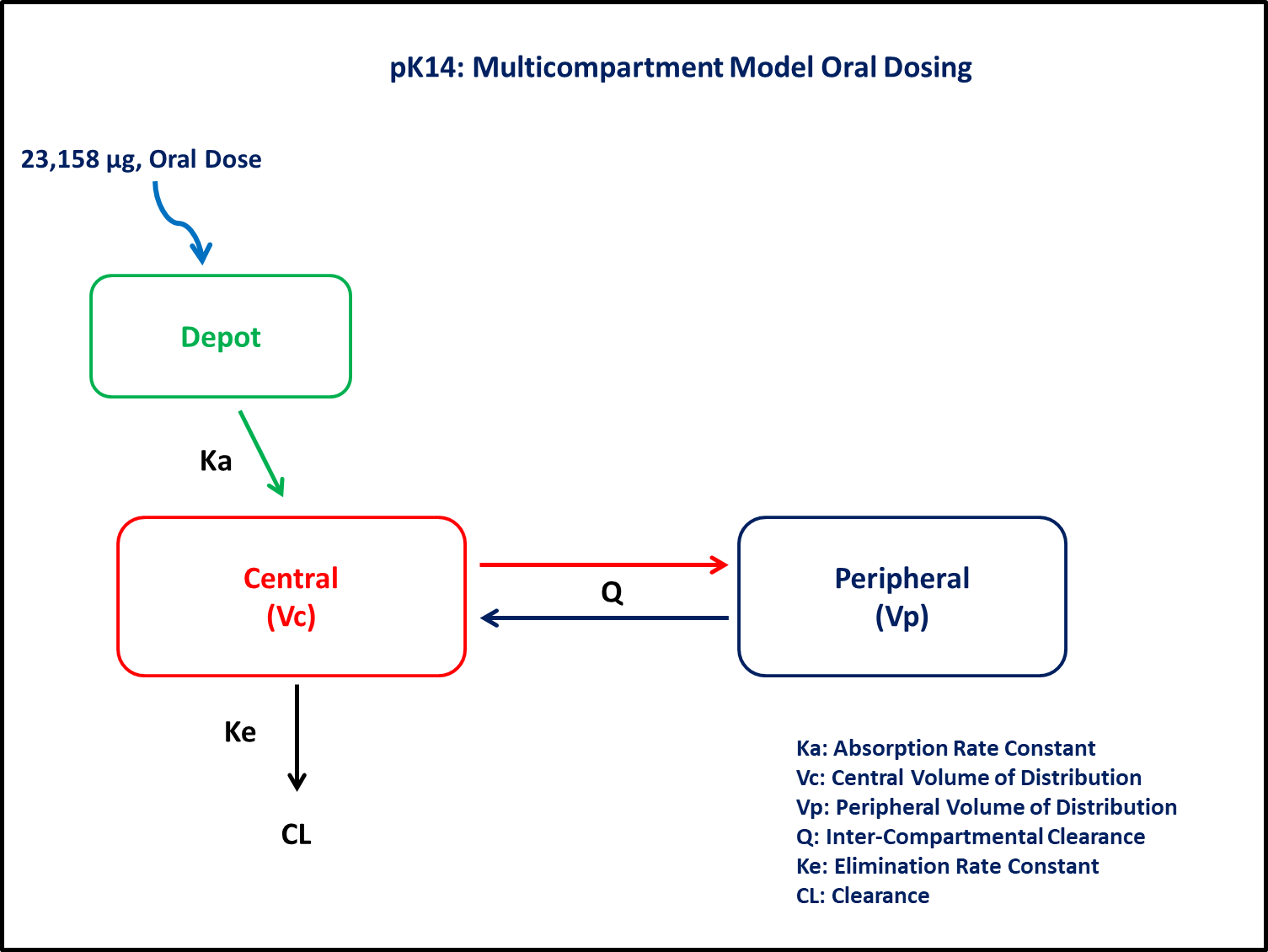 Ka- Absorption rate constant (hr⁻¹)Vc- Volume of central compartment (L)Vp- Volume of peripheral Compartmental (L)CL- Clearance (L/hr)Q- Intercompartmental clearance (L/hr)lag- Absorption lag time (hr)