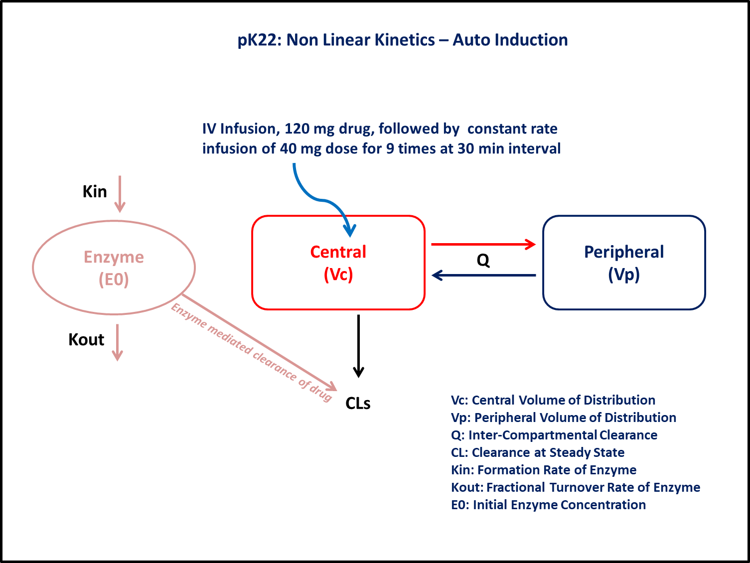 This model gives an understanding of drug pharmacokinetics and enzyme autoinduction simultaneously after repeated IV infusion.