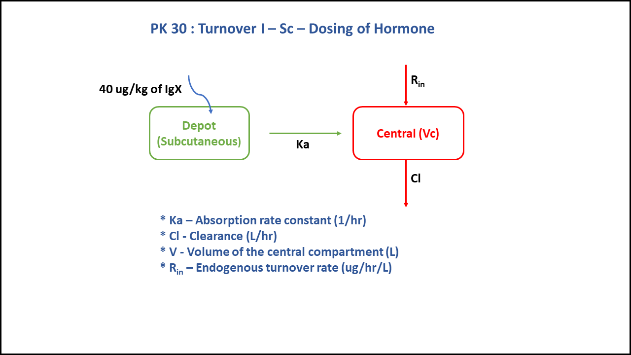 In this tutorial, you will learn how to build a one compartment PK turnover model, following first order elimination kinetics and zero order hormone production.