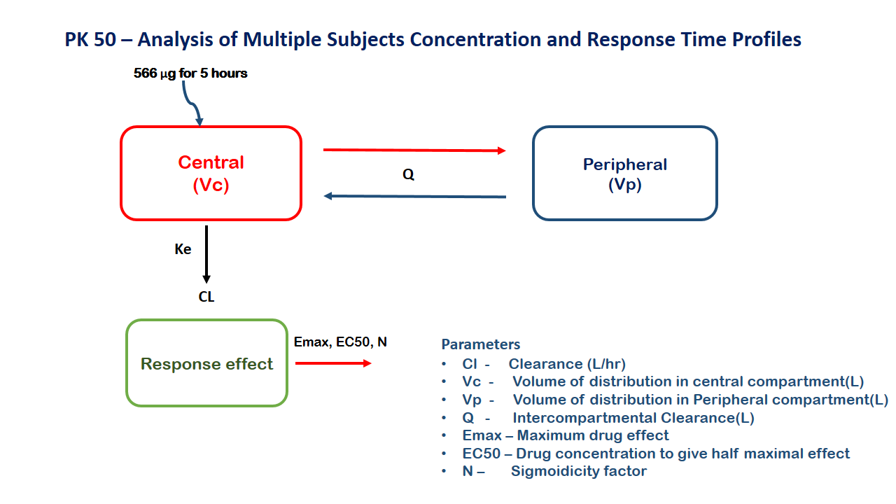 Cl- Clearance (L/hr)Vc- Volume of distribution in central compartment (L)Vp- Volume of distribution in Peripheral compartment (L)Q- Intercompartmental Clearance (L/hr)EC50- Concentration which produces 50% effect (μg/L)Emax- Maximum Effectsigma- Sigmoidicity factor