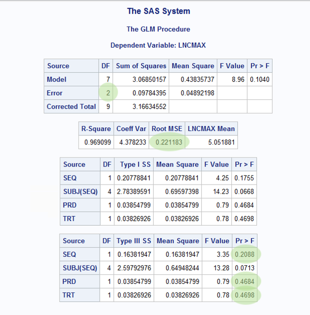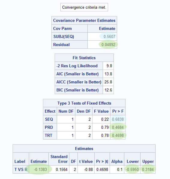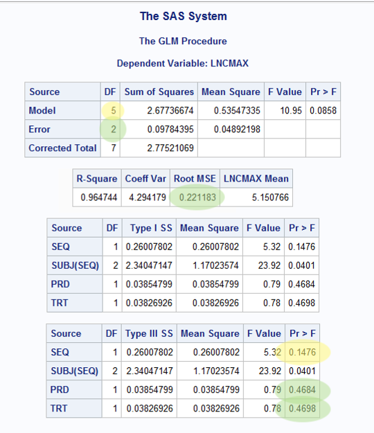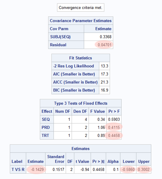 Finally consider the data_2020_PKB dataset which includes subjects \(3\) and \(6\) having partial observations (only the first period and not the second). Here we see different numerical results because PROC MIXED uses the data also from all subjects including those with partial observations. We highlight those results in light red: