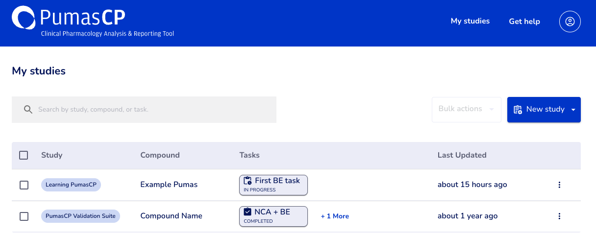 When you log onto PumasCP you are presented with a list of all of your studies. A study is related to a Compound.