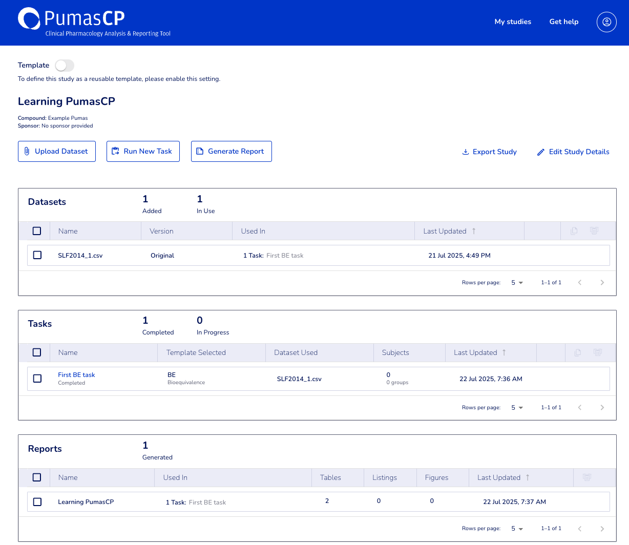 Then once you are focused on a particular study, the key actions you can cary are uploading a dataset, Run a New Task, or Generate a Report:
