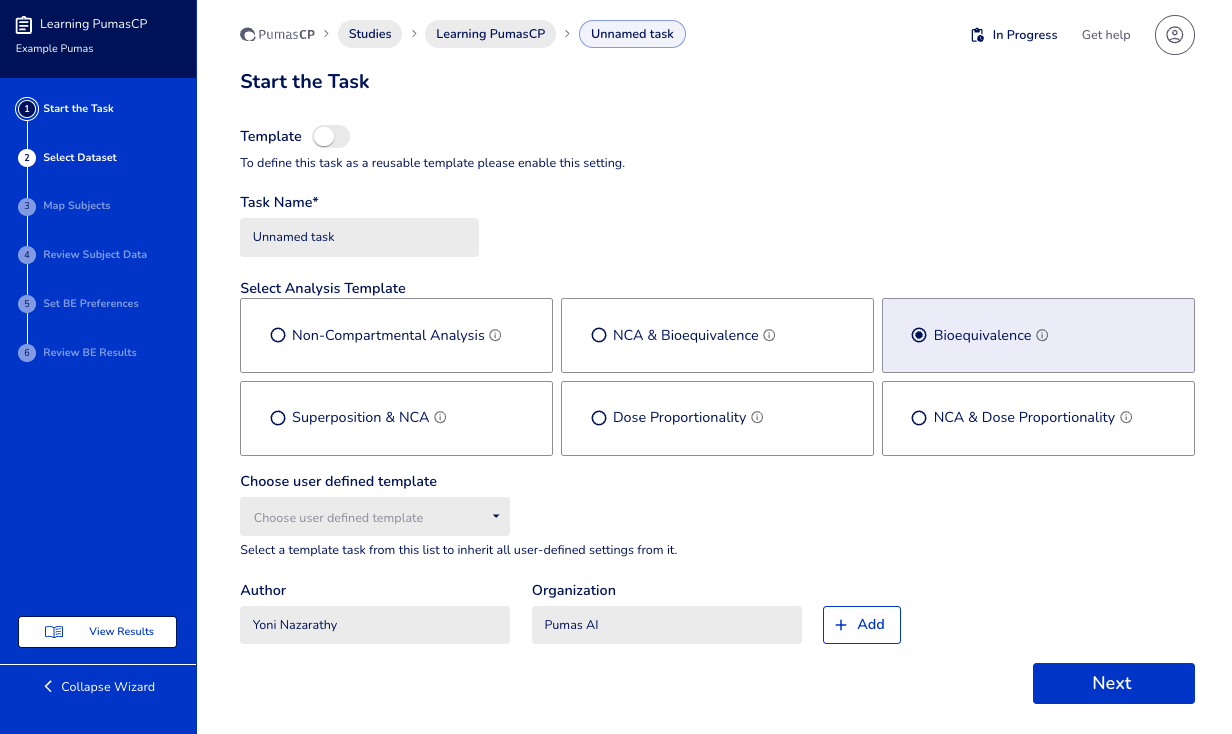 📋 Run New Task. A page titledStart the Taskappears. Change the name of the task fromUnnamed tasktoBE analysis 1. Then choose theBioequivalenceoption. Finally hitNext. - Select dataset for the task (part of task): You will see the