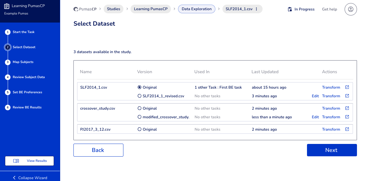 Obviously, PumasCP operates based on collected experimental data. After you upload the data, within the task, you Select Dataset to indicate which dataset (from the those available in the study) is going to be used in the task.