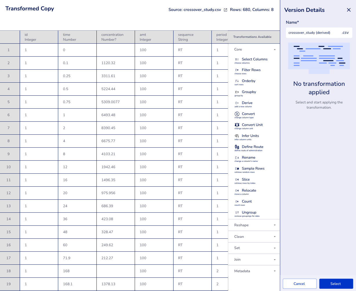 crossover_study.csvand chooseTransform. A popup will appear titledTransformed Copy. This dataset has the first 168 hours (week) for period 1 and the remaining 168 hours for period 2. You can observe this by looking at rows 17 and 18 where theperiodfor subjectid1 changes from1to2. Our transformation will be to take the times in period and subtract 168. - Derive a column (part of the transform step): Hit