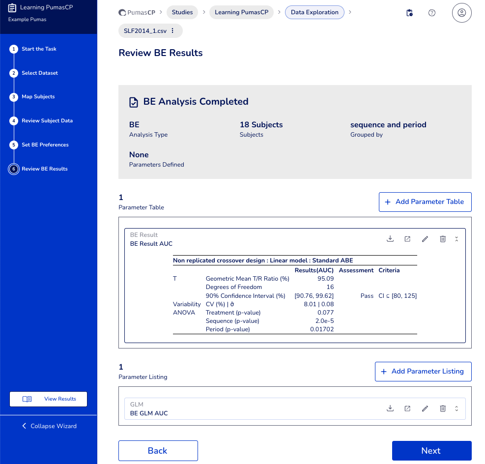 NCA parameter listing. These are now the calculated endpoints per subject and period. Then hitNext. - Review Data for BE (part of task): At this point the task transitions from NCA analysis to BE analysis. Increase the